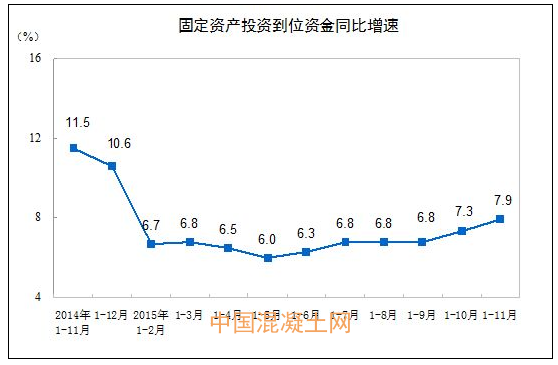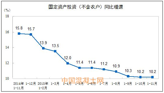 2015年1-11月份,全國固定資產投資(不含農戶)497182億元,同比名義增長10.2%,增速與1-10月份持平。從環比速度看,11月份固定資產投資(不含農戶)增長0.73%。