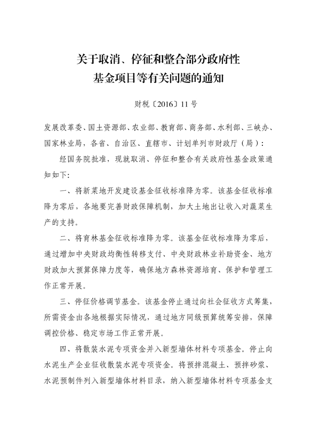 財(cái)政部關(guān)于取消、停征和整合部分政府性基金項(xiàng)目等有關(guān)問題的通知