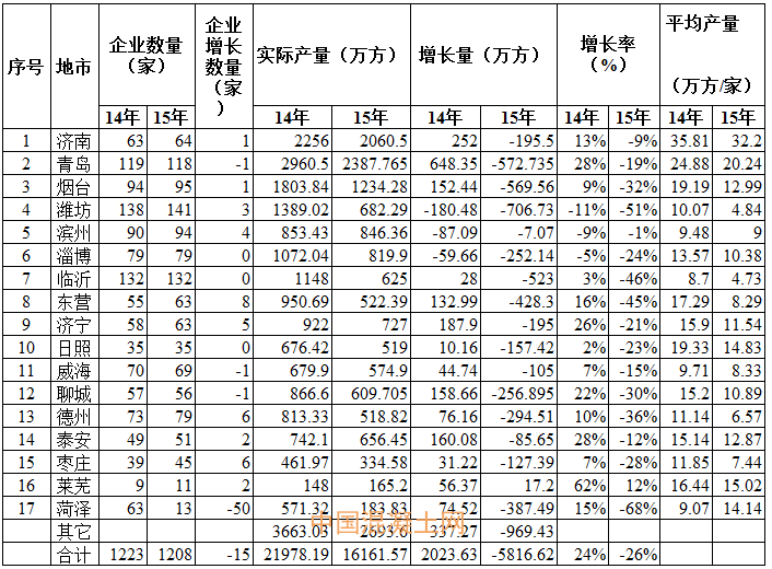 山東省2015年17地市預拌混凝土生產企業及產量統計對比表