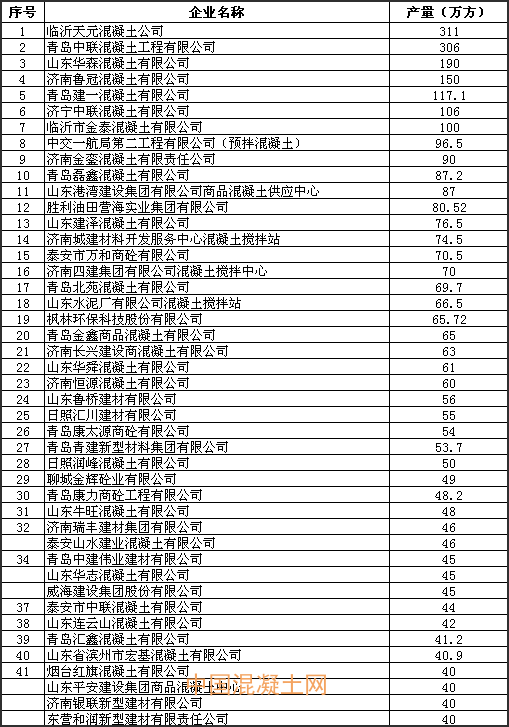 2015年山東省預(yù)拌混凝土產(chǎn)量前40萬(wàn)方以上的企業(yè)名單
