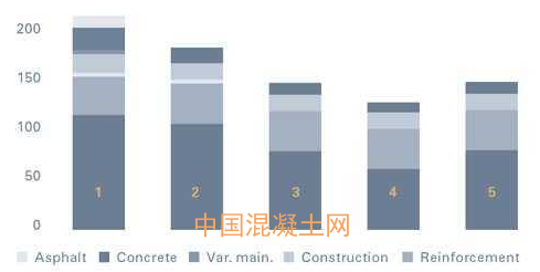 上圖為該中心制作的一張使用不同配制方案混凝土后的碳排放情況對比圖,條柱1為使用傳統鋼筋和瀝青的碳排放情況,條柱2、3、4、5均為使用不同綠色混凝土后的碳排放情況。可以看出使用綠色混凝土后的碳放量明顯較低,充分說明它的環保性能的確值得信賴。