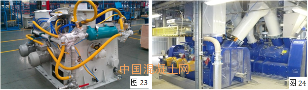 可機械施工性:主要是指砂漿產品的高層氣力輸送如G140(圖28)、連續攪拌、泵送或噴涂性能。生產線的篩分系統、混合系統、配料系統與砂漿產品的施工性能密切相關。高效連續攪拌機(圖29)幾乎適合除了石膏產品之外的所有砂漿產品的加水攪拌;穩定的自動加水連續攪拌是其特征,但這種攪拌技術需要干混料內的各種粉料和添加劑非常均勻的分散,粉料和砂非常充分的混合均勻,均勻的加水量和均勻的粉料即可形成恒定的新拌砂漿。此外,諸如抹灰砂漿、飾面砂漿、保溫體系砂漿、自流平、灌漿料等產品經常需要混漿泵(圖30)來機械施工,除了添加劑和粉料的作用外,砂的級配是否合理連續(如圖27)極大地影響到砂漿的泵送性和施工性,而這一點是被大多數干混砂漿企業所忽視、拒絕、否認或者無能為力的,因為其生產線無法進行砂的分級和搭配。即使是手工施工,如果僅僅砂的粒徑達到了配方要求,而級配不好的話,砂漿的施工性也較有限,除非增加各種功能性添加劑和其他粉料的使用,但這增加了材料的配方成本。