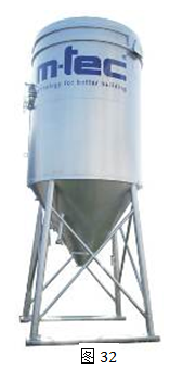 特種砂漿散裝化及小型筒倉:生產線的工藝設計中,成品的輸送地址可以盡可能的靈活全面,成品可以以散裝、噸袋、小型筒倉、包裝的形式提供給客戶。砌筑、抹灰及地坪砂漿一般采用專用運輸車和22方移動筒倉(圖32)形式實現散裝銷售。實際上,建筑工程用的外墻外保溫體系的粘結和抹面砂漿、外墻瓷磚砂漿、自流平等產品仍然可以采用這一散裝形式實現銷售,不但大大節約了包裝成本,而且因筒倉自帶的連續攪拌機使用更加方便。1-3方的小型筒倉(圖33)更加可以靈活的將砂漿產品投放在市場區域內,存儲和使用都很方便。