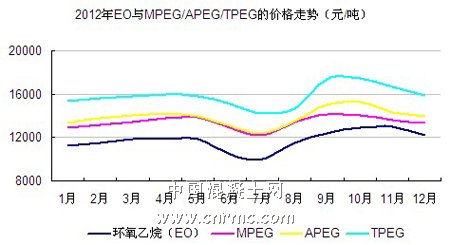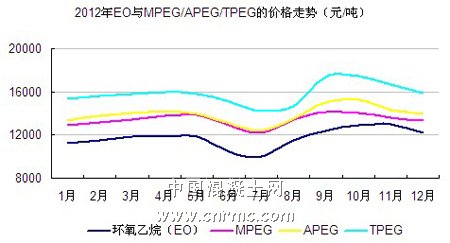 2012年,建材市場開工率一直不佳,減水劑市場隨之低迷。原料環(huán)氧乙烷波動(dòng)較大,但是仍然帶不起聚羧酸市場,只是象征性的浮動(dòng)200-300元/噸。老東家鐵道部也在2012年年底完成了5000億元投資的承諾,但是很顯然,高鐵的資金投入并沒有使聚羧酸市場有明顯的起色。各大網(wǎng)站,新聞也多以“維穩(wěn)”形容聚羧酸市場。