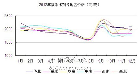 2012年,萘系減水劑市場持續(xù)探底。以萘系水劑為例,2012年3月,萘系水劑價(jià)格跌破2000元/噸大關(guān);8月,萘系水劑價(jià)格跌至1639元/噸,為全年最低。9月,隨著工業(yè)萘的大幅上揚(yáng),帶動(dòng)起萘系減水劑市場,但是終端市場的疲軟態(tài)勢導(dǎo)致減水劑市場走貨一般,僅僅將價(jià)格略微上抬后便再無起色。最后2月,多以走訪尾款為主。因此,2012年的減水劑市場價(jià)格則以1942元/噸劃上了句號(hào)。