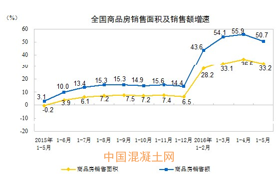 1-5月份,商品房銷售面積47954萬平方米,同比增長33.2%,增速比1-4月份回落3.3個百分點。其中,住宅銷售面積增長34.2%,辦公樓銷售面積增長44.0%,商業營業用房銷售面積增長18.1%。商品房銷售額36775億元,增長50.7%,增速回落5.2個百分點。其中,住宅銷售額增長53.4%,辦公樓銷售額增長72.8%,商業營業用房銷售額增長21.2%。