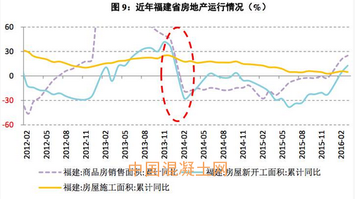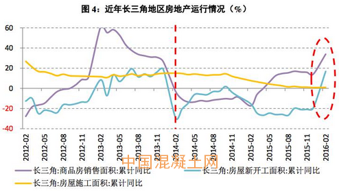 長三角地區除安徽省外,江浙滬區域基礎設施建設均較為完善,城鎮化水平相對較高,水泥需求主要受房地產投資影響(2009年二者出現背離主要系在“四萬億”計劃刺激下基建投資對水泥需求形成強力拉動,詳見圖3)。2014年以來隨著三、四線城市及部分二線城市房地產去庫存壓力加大,開發商拿地熱情持續低迷,長三角地區房屋新開工面積同比大幅下降(2015年降幅接近20%)。雖然2016年初在寬松貨幣政策的刺激下,商品房銷售面積大幅增長,房企開工意愿增強,帶動房屋新開工面積同比有所回升,但考慮到房地產市場供需失衡的基本面仍無明顯改善,加之3月底出臺的樓市調控政策亦使得需求降溫,預計全年房屋新開工面積同比仍將有所縮減,但降幅有望收窄;結合前期累計新開工情況以及竣工面積增速持續下滑,我們預計長三角地區房屋施工面積同比或將持平,難以對水泥需求形成有力拉動。
