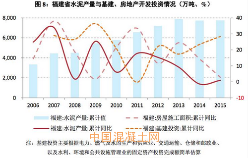福建省地處東南沿海地區,但相比其他經濟發達的沿海省份,區域發展不平衡,山海、城鄉差距較大。從水泥需求表現來看,2012年前福建省水泥市場相對封閉,處于快速成長期,2012年后隨著需求增長放緩及外來(海運)水泥進入,水泥產量步入高位平臺期,2015年在全國需求普降的背景下,福建省水泥產量仍保持近1%的微增。從水泥需求的影響因素來看,不同于大多數省份主要依靠房地產投資拉動,福建省水泥需求波動更多體現為房地產和基建投資共同作用的結果。