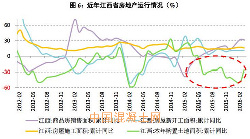 展望2016年,房地產投資方面,雖然2015年省行政中心搬遷以及部分新區建設加快刺激市場需求釋放,江西省房地產銷售有所回暖,房屋新開工面積繼前期大幅回落后有所反彈,但受宏觀經濟景氣低迷影響,剛性需求逐漸減弱,加之省內三四線城市房地產開發存在前期擴張、開發過度、人口外流、有效需求不足等問題,江西省房地產市場去化壓力較為突出。在以“去庫存”為主的政策基調下,加之前期土地購置面積大幅走低,2016年江西省房屋新開工面積增速預計難以維持現有高位水平,房屋施工面積增速或將小幅下行。