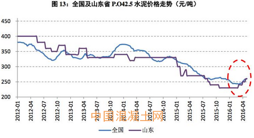 從區域競合關系來看,山東省主推中聯水泥和山東山水兩家企業整合市場,逐步形成了目前以大規模產線(4,000t/d以上)為主的產線分布結構,產能集中度較高(截至2015年末CR3為64.47%),區域內規模排名前兩位的中聯水泥和山東山水保持良好的競合關系,通過協同限產、控制產能發揮改善市場供需,競爭相對有序。從2015~2016年采暖期錯峰生產執行情況來看,山東省執行力度亦較強,4家未按照要求停產的水泥企業被強制停產。受益于淡季停窯,庫存偏低位運行,加之天氣晴好、需求逐步啟動,2016年3月以來山東省水泥價格在主導企業推動下先后3次上調;但考慮到2016年供需關系整體將較2015年進一步弱化,行業下行期企業自律限產形成的量價弱平衡易被打破,預計山東省水泥價格難以持續回升。