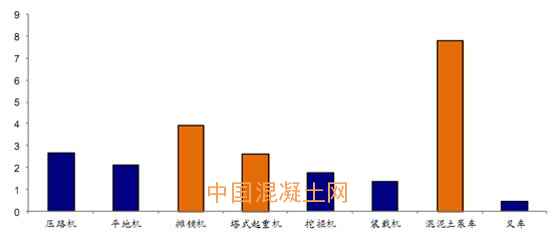 2015 年工程機械的設備的租賃利用率相對排名與2013年類似,在主要的工程機械品種中,利用率排名靠前的為使用頻率較低并且月租金相對較高的混凝土泵車和塔式起重機。不過需要特別指出的是,2015 年工程機械租賃整體利用率下滑明顯,之前租賃利用率較高的品種如塔式起重機 2015 年的利用率估計只有 50%-55%,挖掘機的租賃利用率甚至下降到不足 30%。我們認為,在現行的經濟環境下,行業依然可以通過提高租賃服務的水平來提高利用率。
