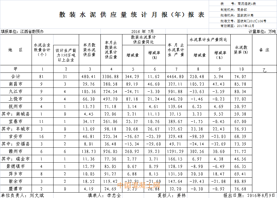 2016年1-7月江西省散裝水泥供應(yīng)統(tǒng)計(jì)表