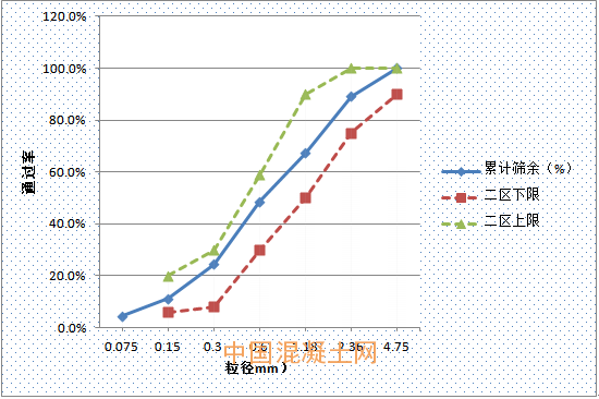 如下圖所示,甘肅建投V7制砂生產線的成品砂顆粒級配曲線嚴格落在國家建設用砂標準機制砂顆粒級配二區范圍內。
