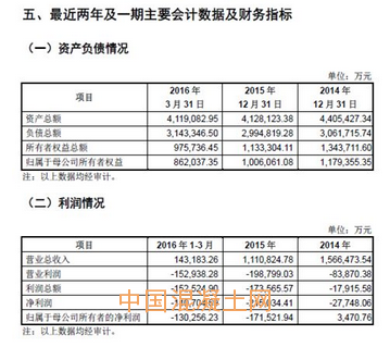 然而冀東水泥在今年4月26日發(fā)布的2016年第一季度季報中,所披露的財務(wù)數(shù)據(jù)卻是另外一個版本:資產(chǎn)總額為414.44億元、歸屬于母公司股東的凈資產(chǎn)為91.18億元,同時在今年第一季度實現(xiàn)銷售收入14.4億元、實現(xiàn)歸屬于母公司股東凈利潤則為-8.05億元。