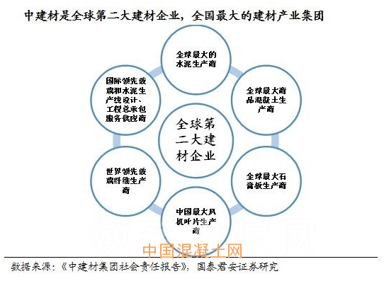 中建材是全球最大的水泥生產商、商品混凝土生產商和石膏板生產商;世界領先的玻璃纖維生產商和玻璃和水泥生產線設計、工程總承包服務供應商;以及全國最大的碳纖維生產商和領先的風機葉片生產商。集團共有水泥、玻璃、輕質建材、新型房屋、玻璃纖維、碳纖維、光伏部件、風機葉片、耐火材料等業務板塊,從而構建起實力雄厚的水泥、玻璃、輕質建材、新型房屋、玻璃纖維、復合材料、耐火材料等產業平臺公司;并形成包括產業制造、科技研發、成套裝備、物流貿易和認證服務在內的五大業務活動。