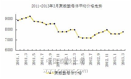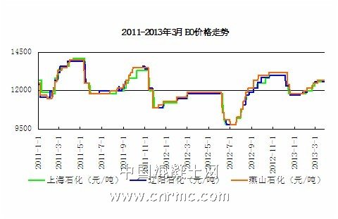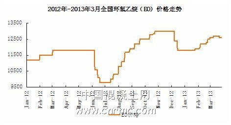 進入2013年,環氧乙烷市場內波動與2012年相比稍顯平穩。農歷新年過后,環氧乙烷市場逐漸復蘇,各地工廠陸續開工,但是交投氣氛尚未復蘇,價格一直平穩運行。至二月下旬,EO價格經過一小輪上漲,截至2013年3月,國內環氧乙烷均價目前維持在12600元/噸附近。
