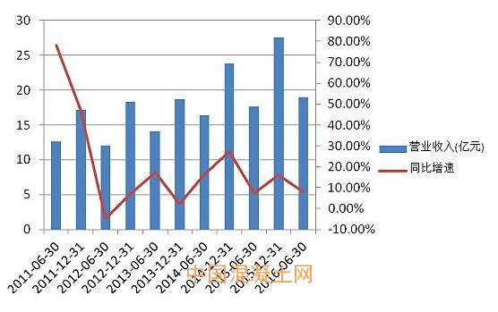 記者將2011年以來環保產業板塊的數據按照上半年、下半年進行劃分,發現雖然2016年上半年環保產業板塊的營業收入是2011年以來最高的,但同比增速(此處上半年與上半年相比較、下半年與下半年相比較)僅為7.86%,略高于2015年上半年的7.40%以及2012年上半年的-4.96%,與2011年(77.91%)、2013年(17.43%)以及2014年(16.51%)的水平相比,有明顯放緩的趨勢。