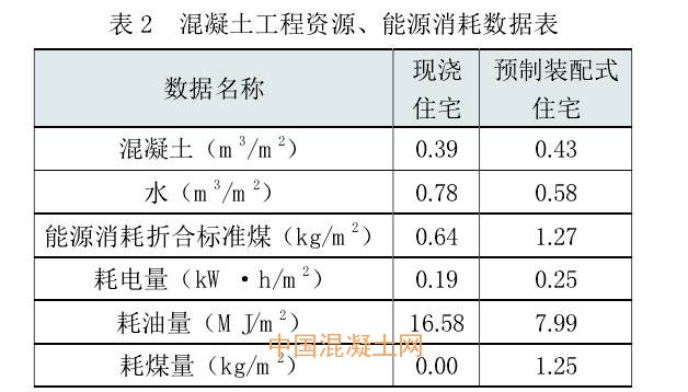 資源消耗包括預制構件生產和施工現場混凝土的消耗量;水資源消耗量包括現澆混凝土和預制構件的養護用水量以及施工機具的清洗用水量。