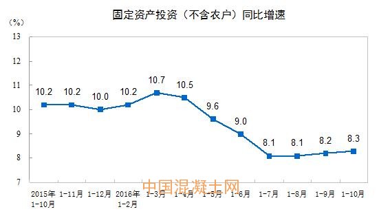2016年1-10月份,全國固定資產(chǎn)投資(不含農(nóng)戶)484429億元,同比名義增長8.3%,增速比1-9月份加快0.1個百分點。從環(huán)比速度看,10月份固定資產(chǎn)投資(不含農(nóng)戶)增長0.58%。