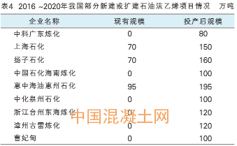 低油價背景下石腦油裂解裝置競爭力逐步增強,對部分前期規劃而進程緩慢的石腦油裂解項目的建設起到一定的促進作用,但因石腦油裂解裝置建設周期相對較長,2016年暫無新裂解裝置投放,新增能力仍來自煤制烯烴。預計2016年,新增能力為230萬噸,乙烯總產能將達到2430.5萬噸,同比增長10.5%。2016~2020年我國新建或擴建石油法乙烯生產裝置如表4所示。預計2016年我國乙烯總產量將達到1835萬噸,同比增長4.3%。