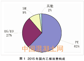 從國內乙烯消費結構看,目前聚乙烯(PE)是乙烯消費第一大用戶,占乙烯消費的62%左右,環氧乙烷/乙二醇(EG/EO)是乙烯消費第二大用戶,約占27%,苯乙烯約9%,其他約占2%。2015年國內乙烯的消費構成如圖1所示。預計2020年國內乙烯消費結構中,聚乙烯和環氧乙烷/乙二醇在消費結構中的比例繼續有所上升。