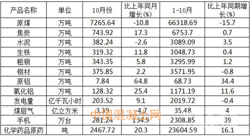分產品產量看:10月份,全省12種主要工業產品產量“9升3降”:原煤產量下降10.8%,水泥下降2.6%,煤層氣下降4.7%;焦炭增長17.3%,生鐵增長11.8%,粗鋼增長5.8%,鋼材增長2.2%,原鋁增長64.8%,氧化鋁增長25.4%,發電量增長9.1%,手機增長134.9%,化學藥品原藥增長20.3%。