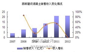西部建設股份有限公司是混凝土行業內的老牌企業,常年以商品混凝土為核心業務,混凝土業務的收入更是占了總收入的99%。2012年,混凝土行業受上下游影響,市場形勢欠佳,但是公司仍保持上升態勢。年報顯示,公司2012年混凝土銷量達到651萬方,較2011年上升11.01%;實現營業收入21.19億元,比2011年上升0.81%;實現利潤總額1.75億元,比2011年上升8.02%,凈利潤1.34億元,比2011年上升8.94%。