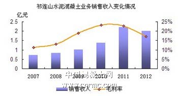 祁連山水泥:2012年祁連山水泥營業收入為42.48億元,較2011年上升了17.18%。混凝土方面,公司營收略有下降,較2011年下降了9.59%。但公司已經計劃加大混凝土攪拌站的建設,增加生產能力。據悉,公司將于今年計劃新增混凝土產能160萬方,增加混凝土銷量120萬方。