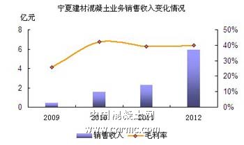 寧夏建材:2012年寧夏建材混凝土業務實現銷量,營收雙增長。數據顯示,公司全年實現混凝土營業收入5.9億元,同比增長158%,混凝土銷量193.77萬方,同比增長173.49%。未來隨著公司混凝土攪拌站的陸續建成,公司將擁有6座年產能在年產50萬立方米商品混凝土攪拌站。同時,公司計劃在2013年實現混凝土銷量260萬方。