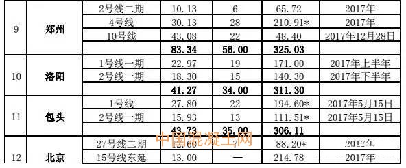 據不完全數據統計顯示,2017年,中國有北京、廣州、深圳、佛山、中山、南京、蘇州、青島、杭州、無錫、合肥、福州、寧波、常州、蕪湖、南通、紹興、天津、太原、呼和浩特、包頭、洛陽、重慶、成都、長沙、鄭州、長春、大連、吉林、西安30座城市軌道交通新增63條即將開工線路,合計里程為1581.35公里,車站826座,總投資額為11480.21億元。