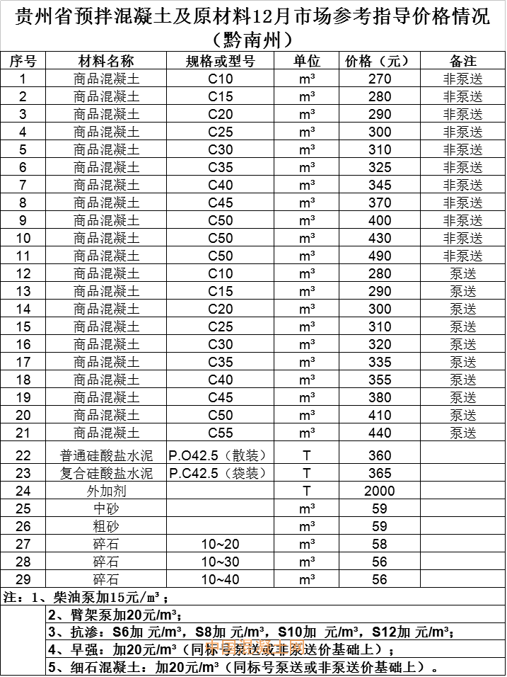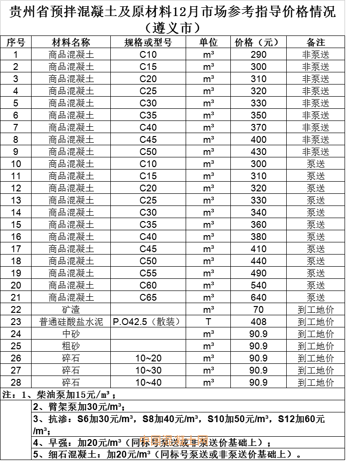 貴州省預拌混凝土及原材料12月市場參考指導價格情況