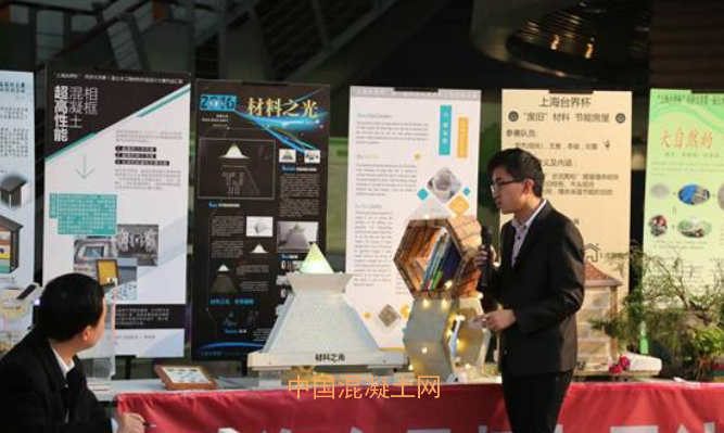 首先是作品介紹階段,各參賽組按次序由一名同學進行一段簡短的作品介紹。不論是構思精巧的地聚合物書桌擺件系列,還是高端大氣的“材料之光”,創意新穎的彩色透水混凝土,簡潔輕盈的“砼舟共濟號”……參賽隊員們無不旁征博引,緊扣本次比賽的主題“節能與環保”侃侃而談,使出渾身解數把作品和展板的精華濃縮在這1分鐘里,真是字字珠璣,精彩介紹如連珠炮一般應接不暇,令人拍案叫絕。