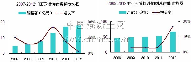 公司是經(jīng)江蘇省建筑科學研究院建筑材料研究所改制而成的科技先導型企業(yè),專業(yè)從事混凝土外加劑相關技術的研究和開發(fā)應用工作。在混凝土外加劑領域,已形成科研開發(fā)、規(guī)模生產(chǎn)和專業(yè)化技術服務的完整體系。2012年公司主營業(yè)務收入達到17.78億元,除稅銷售收入為15.20億元,總產(chǎn)能達66.3萬噸,混凝土及外加劑相關專利高達87項;另外,公司2012年實現(xiàn)聚羧酸銷量17.46萬噸,聚羧酸減水劑除稅銷售收入達7.80億元,聚羧酸產(chǎn)能達34.5萬噸,市場占有率高達7.59%,在2012年度中國混凝土網(wǎng)評選的外加劑企業(yè)綜合排名及聚羧酸減水劑企業(yè)十強排名中均位居第一,蟬聯(lián)榜首。