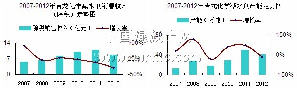 據(jù)公司提交相關數(shù)據(jù),2012年公司主營業(yè)務收入達到10.08億元,除稅銷售收入為8.62億元,總產(chǎn)能達41.3萬噸,與2011年總體數(shù)據(jù)相比較均有所下降,但并不影響公司減水劑事業(yè)發(fā)展,2012年公司聚羧酸減水劑銷量達5.28萬噸,產(chǎn)能達8.6萬噸,與去年相比也有所提高。未來浙江龍盛減水劑規(guī)模將有較大提升,產(chǎn)能提高及釋放使公司減水劑業(yè)務保持較快增長。