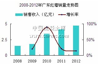 廣東省是我國外加劑生產(chǎn)的重要省份,經(jīng)濟發(fā)展快、科技力量強、科研院校多、市場需求量大,廣東紅墻是在泛珠三角區(qū)域同類型混凝土外加劑企業(yè)中,外加劑銷售收入、綜合利稅位居前列的企業(yè)。公司成立于2005年3月31日,主營業(yè)務為生產(chǎn)、銷售混凝土外加劑。根據(jù)公司往期業(yè)績,2009年至2011年銷售收入分別為1.8億元、3.4億元和4.1億元,2012年公司的銷售收入4.68億元,減水劑產(chǎn)能14.95萬噸,混凝土及外加劑專利達22項,總體業(yè)績相比往年有所提高。