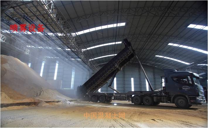 圖為封閉的骨料堆場,砂、石原材料卸料時開啟噴霧,可有效降低骨料堆場內(nèi)的揚塵污染。