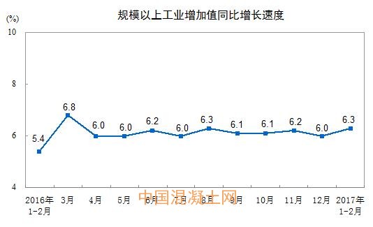 2017年1-2月份,規模以上工業增加值同比實際增長6.3 %(下同,增加值增速均為扣除價格因素的實際增長率),較2016年12月份加快0.3個百分點;從環比看,2月份,規模以上工業增加值比上月增長0.60%。