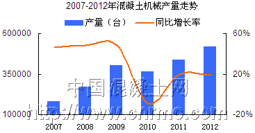 混凝土機械近兩年來在工程機械行業可謂一枝獨秀,特別是2011年,作為“十二五”的開局之年,混凝土機械行業在2011年發展迅猛,全年產量達44萬臺,同比增長近20%。而2012年也延續了前一年的良好勢頭,2012年全年國內混凝土機械產量達51.77萬臺,同比增長18.7%,增速較2011年回落0.62個百分點。