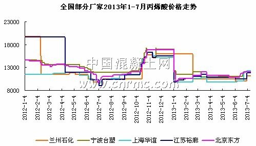 從價格走勢上來看,2013年上半年總體價格與2012年年底相比,呈現走跌狀態,但總體走勢較平穩,無大幅度波動。但由于六月份上海華誼事故導致原本在“金九銀十”才啟動的需求提前,引發丙烯酸價格上漲,導致丙烯酸供應緊張。目前市場上丙烯酸貨源非常少,加上下游丙烯酸酯正在漲價,使得流通中的丙烯酸愈發珍貴,整體來看國內丙烯酸現貨庫存極少,市面上貨源非常緊缺。