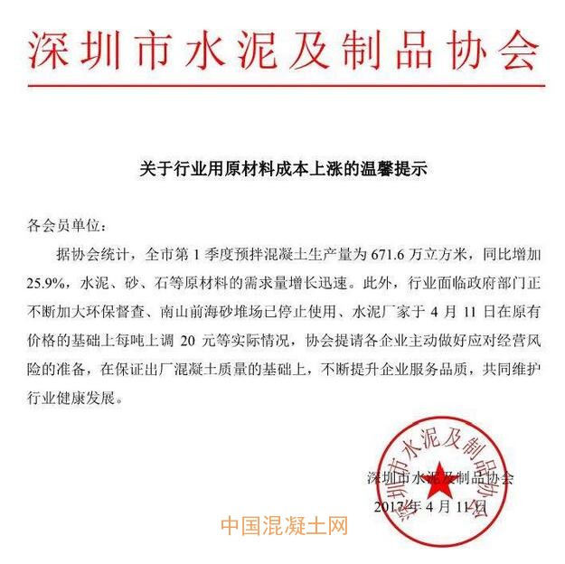 11日,深圳市水泥及制品協會發布關于行業用原材料成本上漲的提示,全市一季度預拌混凝土生產量為671.6萬立方米,同比增加25.9%,水泥、砂、石等原材料的需求量增長迅速。此外,行業面臨政府部門正不斷加大環保督查、南山前海砂堆場已停止使用、水泥廠家于4月11日在原有價格的基礎上每噸上調20元。