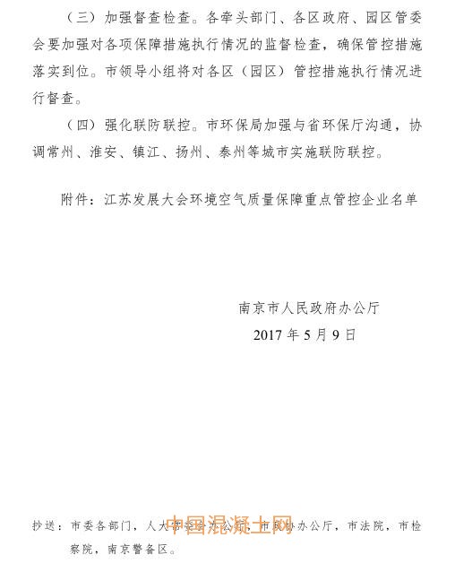 南京市政府辦公廳發(fā)文稱,為切實(shí)保障江蘇發(fā)展大會(huì)期間全市環(huán)境空氣質(zhì)量?jī)?yōu)良,市政府要求,17日起,除市政重點(diǎn)工程外,全市范圍內(nèi)工地全部停工,對(duì)停工工地裸露地采取防塵降塵措施。混凝土攪拌站停產(chǎn)。全市范圍內(nèi)暫停渣土、沙石等易揚(yáng)塵污染的運(yùn)輸;暫停自卸車傾倒作業(yè),以及碼頭和船舶煤炭、礦石、砂石等易產(chǎn)生揚(yáng)塵物料的裝卸作業(yè)。保障時(shí)段:5月17-22日(共6天)。