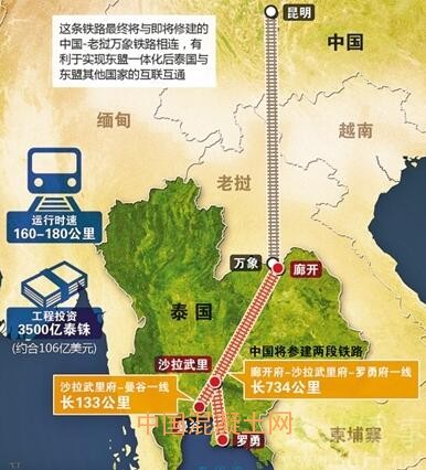 2015-06-26新聞“泰國副總理稱中方將在泰修建中速鐵路”報道:泰國副總理帕蒂亞通稱,放棄高鐵方案,聯合修建首都曼谷至廊開873公里的中速鐵路(即快速鐵路),該路線的設計時速為160-180公里。