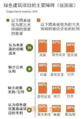 此報告提到,13個國家中有11個都認為更高的初期成本是綠色建筑發展的前三大障礙,這在美國和哥倫比亞地區尤為突出。在巴西、哥倫比亞、印度和波蘭等很多發展中的市場,缺少公共認知以及政策支持是最主要的發展障礙。比起在發展中的市場,在澳大利亞和英國等更多的發達市場,綠色建筑被定義為高端項目的專利是一個更加顯著的障礙。