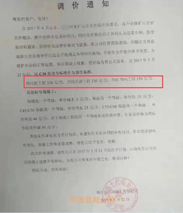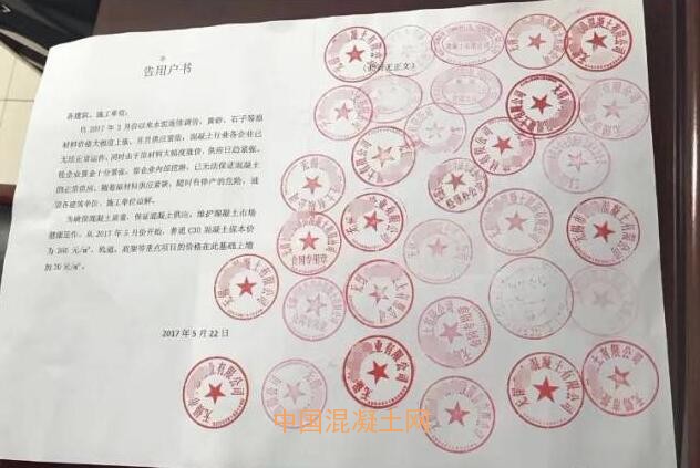”各建筑、施工單位——自2017年3月以來水泥連續調價,黃沙、石子等原材料大幅上漲,并供應緊張,混凝土行業各企業已無法正常運行,砼行業資金十分緊張,隨時有停產危險……………………為保證混凝土質量和供應,從2017年5月開始,普通C30混凝土保本價為360元/方。“