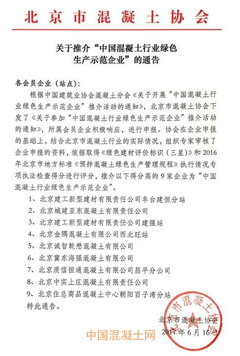 近日,北京市混凝土協會發布通告,協會依據取得《綠色建材評價標識(三星)》和2016年北京市地方標準《預拌混凝土綠色生產管理規程》執行情況專項執法檢查得分進行評分,推介以下得分高的9家企業為“中國混凝土行業綠色生產示范企業”: