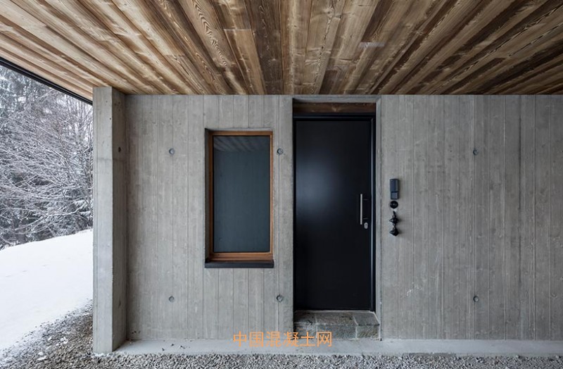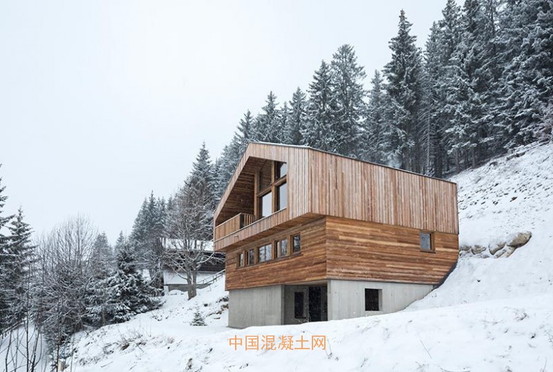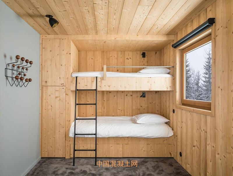 現代化的方法最顯著的使用便是采用混凝土和木材的組合,旨在打破該區域的局限性和墨守成規的美觀性。因此,山屋捕捉并增強了山坡的內在素質,突出了支撐在混凝土基礎上的特殊的木質架構。入口是從混凝土的地基中延伸出來的,內部遵循了臥室和公共區域的木材表現。在客廳里,大玻璃窗跨越頂層,將外面的積雪覆蓋的景觀展現的淋漓盡致。