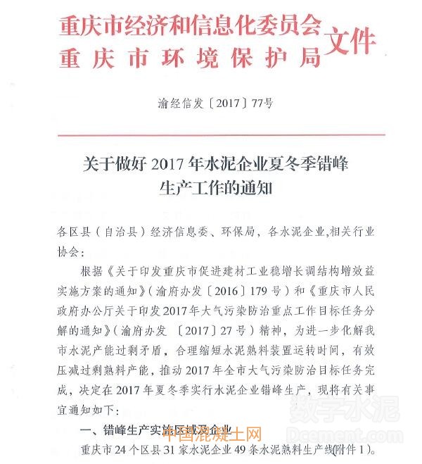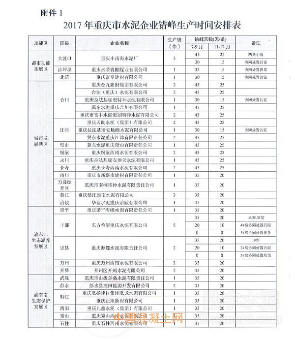 重慶市經濟和信息化委員會和重慶市環境保護局聯合發布了《關于做好2017年水泥企業夏冬季錯峰生產工作的通知》(以下簡稱“通知”)。通知明確,為進一步化解重慶市水泥產能過剩矛盾,合理縮短水泥熟料裝置運轉時間,有效壓減過剩熟料產能,推動2017年全市大氣污染防治目標任務完成,決定在2017年夏冬季(2017年7月1日至9月底、11月1日至12月底)對24個區縣31家水泥企業49條水泥熟料生產線實行錯峰生產。