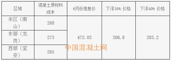 深圳市市場上普遍混凝土價格的制定以每月由市造價站公布的信息價為基礎,然后下浮一定比例,目前的下浮比例在30%至35%左右,在寶安區靠近碼頭附近的個別站點報價已達到下浮40%(按目前原材料價格計算實際混凝土成本和信息價比較見表1)。