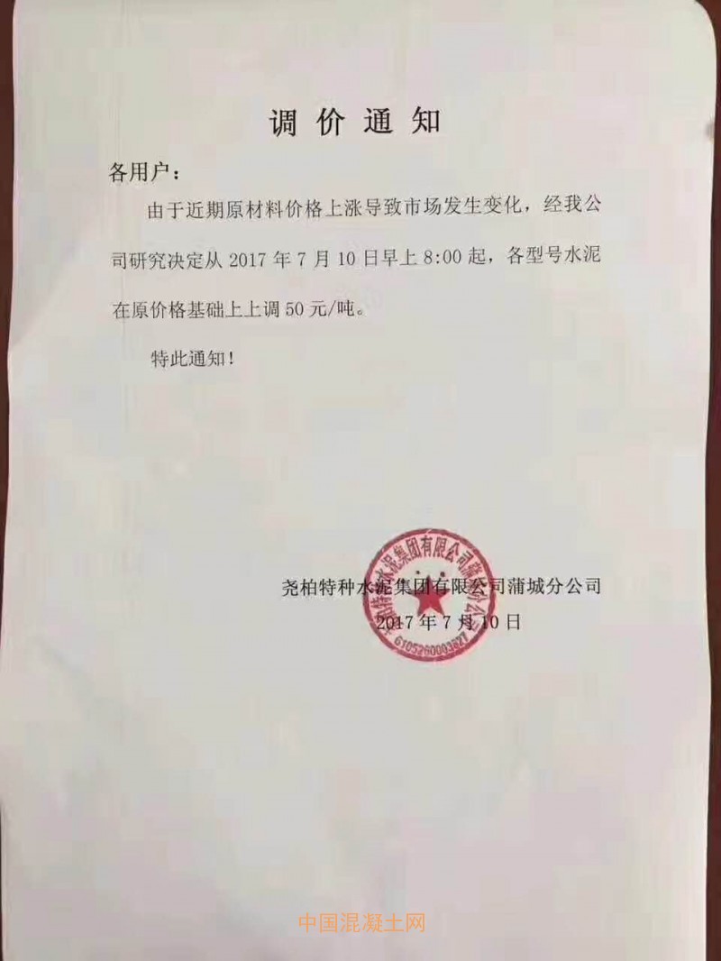 7月10日,陜西關中地區多家水泥企業集體發布調價函,自7月10日8:00時起,各型號水泥價格將上漲50元/噸!