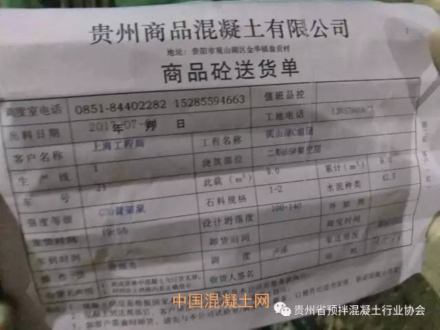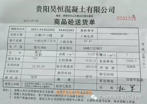 2017年7月4日昊恒公司使用貴州商品混凝土有限公司砼運單進行供貨【生產線:貴州商品混凝土有限公司1號站、客戶名稱:上海工程局,工程名稱:閱山湖C組團、澆筑部位:二期65#架空層】